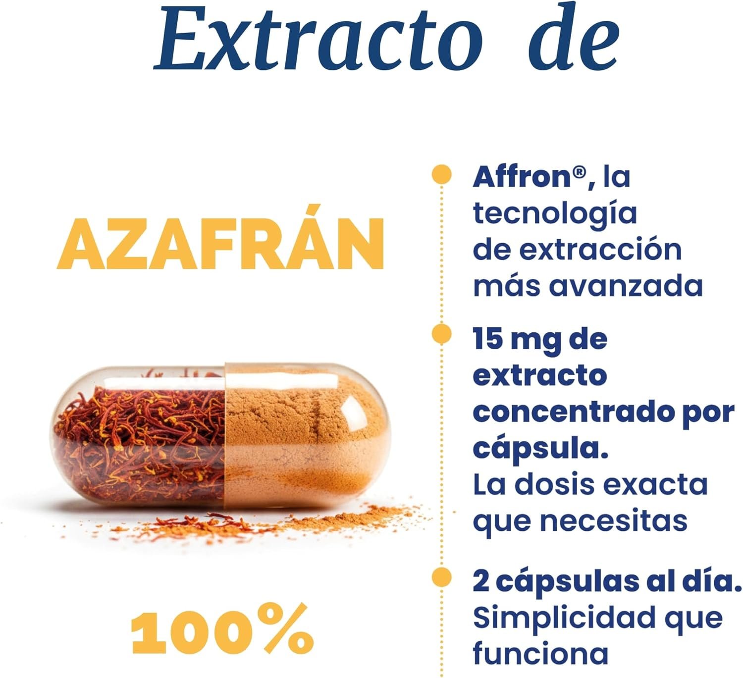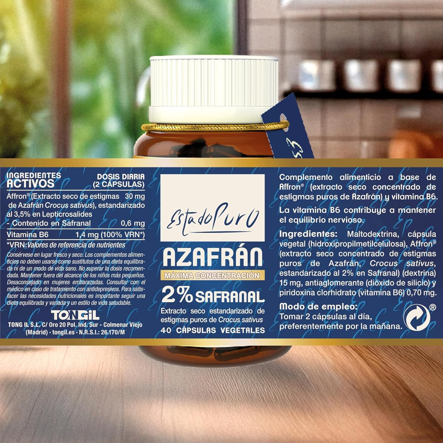 Cada cápsula aporta 15 mg de Affron®, estandarizado al 3,5 % en lepticrosálides, con un 2 % de safranal, el principio activo responsable de sus beneficios sobre el estado de ánimo, la claridad mental y el descanso. La fórmula se refuerza con vitamina B6, reconocida por la EFSA por su papel en el funcionamiento normal del sistema nervioso.