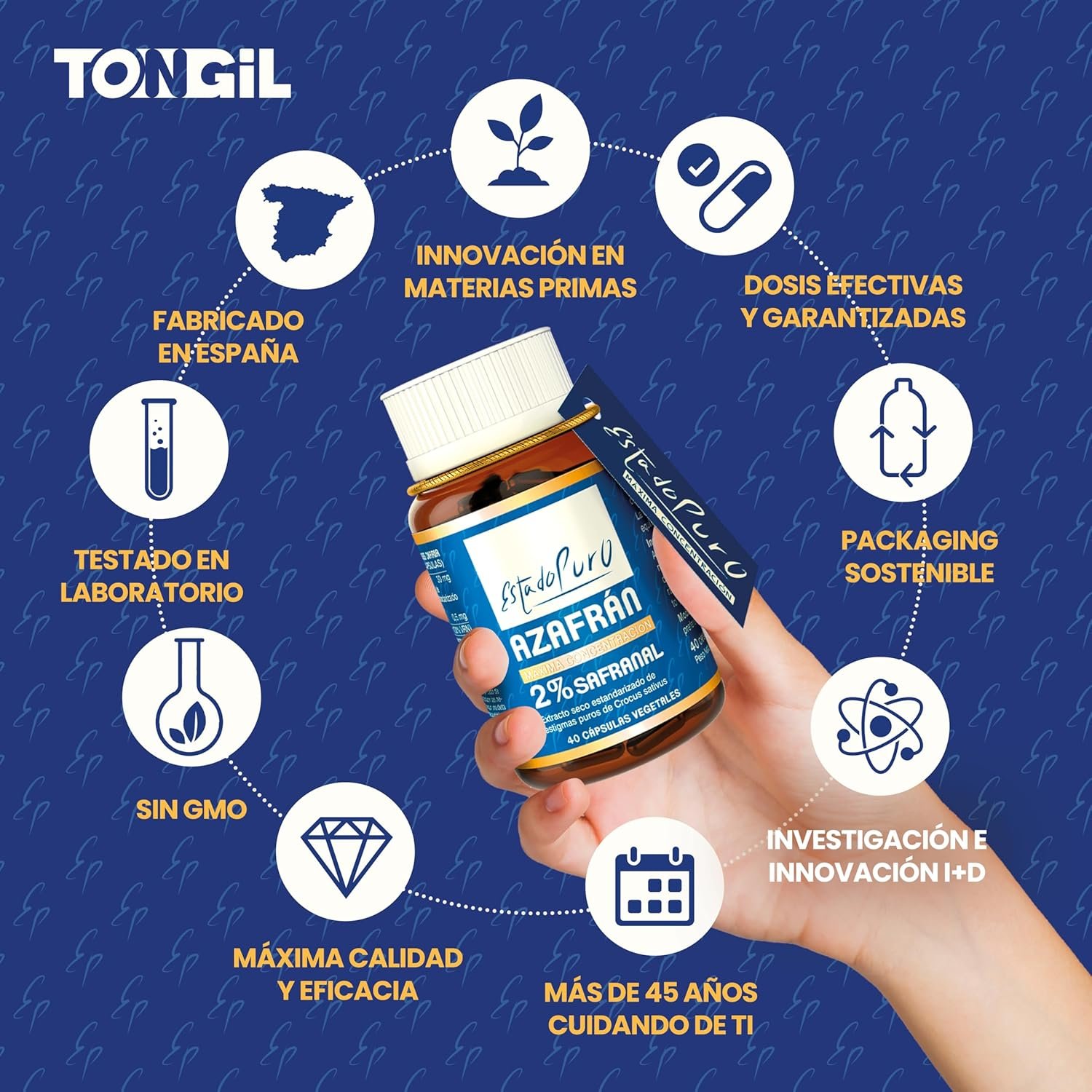 Fabricado en España por TONGIL, referente en fitoterapia con más de 50 años de experiencia. Ingredientes 100 % puros, testados en laboratorios independientes y elaborados bajo estrictas normas GMP y HACCP. Esto no es un suplemento más, es Estado Puro.