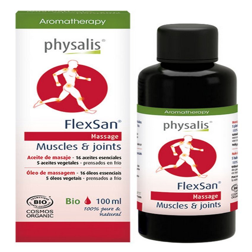 Cuide sus músculos y articulaciones con Physalis FlexSan® gracias a una sinergia de 15 aceites esenciales. Un masaje FlexSan® relaja rápidamente los músculos y articulaciones, favoreciendo así la recuperación. Composición: Con una sinergia de aceites esenciales 100% biológicos de gaulte‐ ria, hierbabuena, ravintsara, eucalipto de limón, romero, jengibre, lavande spica, bálsamo abeto, enebro, salvia esclarea, laurel, tomillo de hojas sabrosas, catafray, clavo, canela china, extracto de romero.