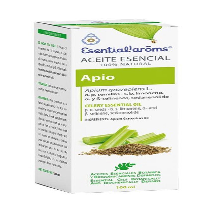 Nombre Botánico: Apium graveolens. Órgano Productor (O.P.): Semillas. Especificidad Bioquímica (S.B.): Limoneno, a y B selinenos, sedanenólido. El aceite esencial se extrae de las semillas de las plantas y es particularmente interesante por sus propiedades drenantes. El gran inconveniente de este aceite esencial es su olor bastante desagradable. Los más convencidos y valientes sacarán partido de este aceite esencial especialmente eficaz para atenuar manchas en la piel.