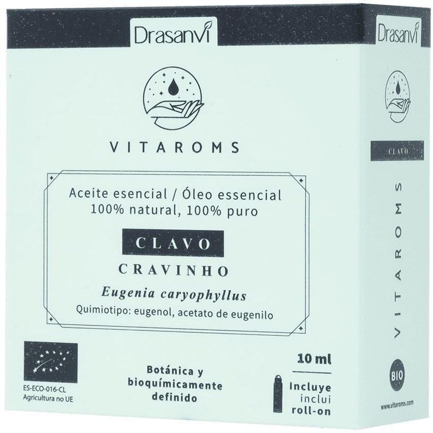 Conocemos, ampliamente, el uso culinario del clavo como especia, pero no tanto su dimensión como aceite esencial. Su amplio espectro de acción hace que esté presente en numerosos preparados fitoterapéuticos, así como de aceites esenciales. Es un aceite esencial a tener en cuenta para diferentes necesidades, sobre todo, para aliviar las molestias dentales. Vitaroms ha desarrollado una línea de productos basada en aceites esenciales BIO con certificado ecológico. Son 100% naturales, 100% puros, además de botánica y bioquímicamente definidos. Propiedades: Antiinfeccioso de amplio espectro. Antibacteriano. Antifúngico. Antimicrobiano. Antiviral. Parasiticida.