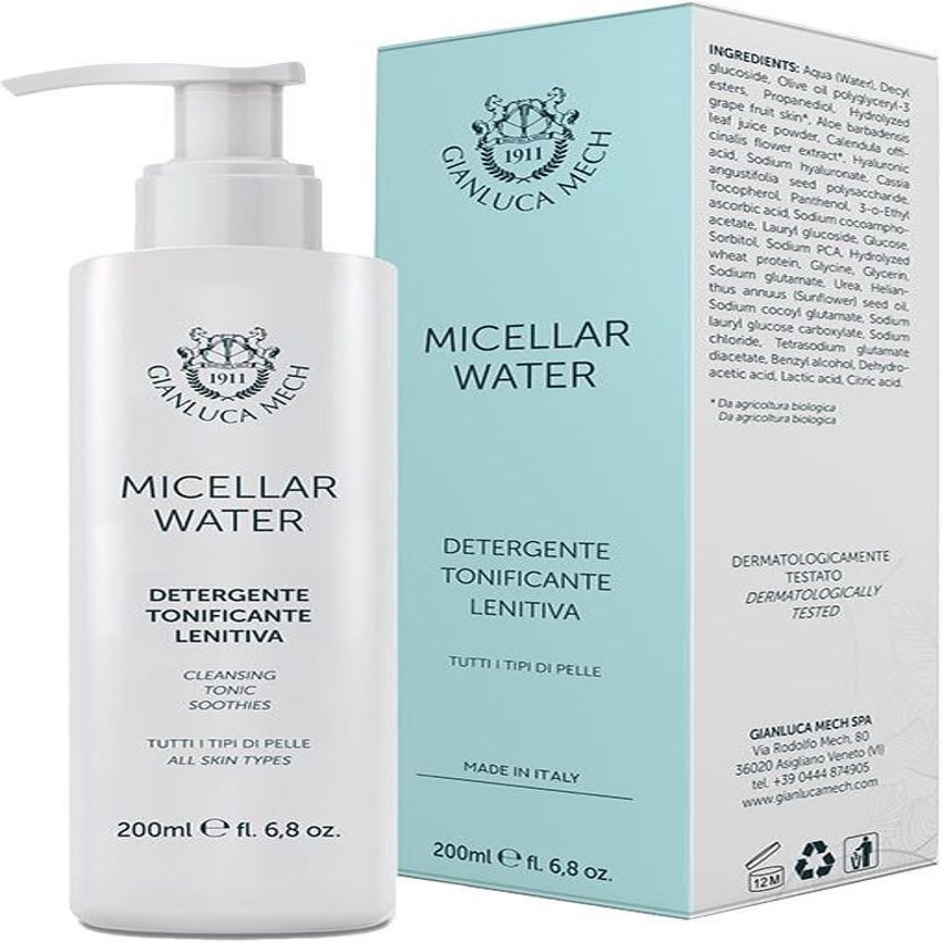 Micellar Water de Gianluca Mech es un producto que gracias a la presencia de extractos orgánicos de Aloe, Caléndula y Uva Roja, limpia y desmaquilla delicadamente la cara y el contorno de los ojos en un solo gesto. Apto para todo tipo de pieles, incluso las más delicadas. Tiene una acción hidratante, nutritiva y calmante, respetando el equilibrio natural de la piel haciéndola más receptiva a tratamientos posteriores, deja la piel fresca y tonificada y aportando, día tras día, una agradable sensación de confort y frescor. La ventaja del agua micelar de Gianluca Mech sobre otros productos es la protección que proporciona a la película de lípidos que cubre naturalmente la piel. Estamos hablando de esa finísima capa que evita la deshidratación de la piel, normalmente reconstituida por algunas cremas. El agua micelar no la elimina y además tiene una propiedad limpiadora que actúa sobre diferentes tipos de suciedad, desde el maquillaje hasta el exceso de sudor. También elimina el maquillaje resistente al agua. Además de todo esto, los beneficios del agua micelar no acaban ahí ya que su uso diario hará que la piel sea más suave, elástica y visiblemente más sana. Composición: Agua, Decyl glucósido, ésteres de poligliceril-3 de aceite de oliva, propanodiol, piel de uva hidrolizada*, polvo de jugo de hoja de Aloe barbadensis*, extracto de flor de Calendula officinalis*, ácido hialurónico, hialuronato de sodio, polisacárido de semilla de Cassia angustifolia, tocoferol, pantenol, ácido 3-o-etil ascórbico, cocoanfoacetato de sodio, lauril glucósido, glucosa, sorbitol, PCA sódico, proteína de trigo hidrolizada, glicina, glicerina, glutamato de sodio, urea, aceite de semilla de Helianthus annuus (girasol), cocoil glutamato de sodio, lauril glucosa carboxilato de sodio, cloruro de sodio, diacetato de glutamato tetrasódico, alcohol bencílico, ácido deshidroacético, ácido láctico, ácido cítrico. (*) De agricultura biológica.