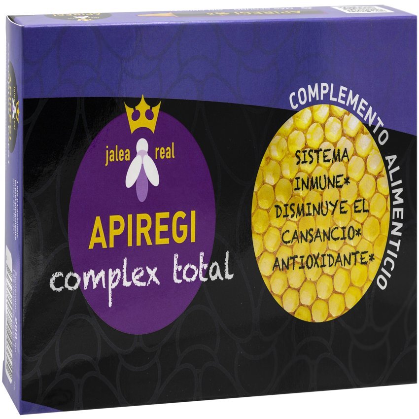 La jalea real es un producto segregado por las glándulas hipofaríngeas y por las glándulas mandibulares de las abejas nodrizas (obreras de 5 a 14 días de edad), cuando disponen de polen, agua y miel. Es el alimento la reina durante toda su vida. Los análisis bioquímicos destacan su riqueza en vitamina C, E, A, vitaminas del grupo B (B1, B2, B3, B6, ácido fólico), minerales (fósforo, hierro, calcio, cobre, selenio), ácidos grasos insaturados, aminoácidos y sustancias hormonales. Entre sus propiedades cabe destacar que posee un efecto estimulante, tonificante y reequilibrante del sistema nervioso, mejora la oxigenación cerebral, regulariza los trastornos digestivos. Aporta la energía extra necesaria a niños y adolescentes en edad escolar, sobre todo en época de exámenes y competición deportiva. Apiregi Complex Total gracias a su composición basada en jalea real enriquecida con aminoácidos, vitaminas y minerales se recomienda en personas (ejecutivos/as, estudiantes, amas de casa) que necesitan más empuje y capacidad de respuesta frentes a situaciones de desgaste tanto físico como intelectual ya que aporta la energía extra necesaria para ellos. Apiregi Complex Total se compone de Jalea Real De Alta Calidad: mínimo 4% en ácido 10-hidroxidecenoico (ácido jaleaareálico-10-HDA).