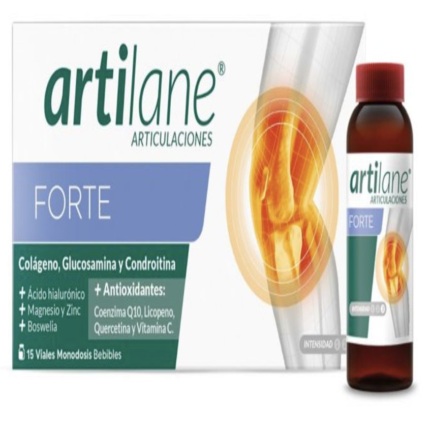 Artilane® la marca experta en articulaciones con más de 10 años a sus espaldas, presenta la nueva gama Artilane® Forte, formulada con altas dosis de Glucosamina y Condroitina. Además contiene extracto de oleorresina de Boswelia. Artilane® Forte es la primera fórmula de un complemento alimenticio en farmacias disponible en monodosis bebible, fácil de llevar, con buen sabor y buena disolución. Artilane® Forte contiene altas dosis de Glucosamina y Condroitina, Colágeno hidrolizado enzimáticamente de alta pureza, Ácido hialurónico, Magnesio, Zinc, Boswelia y antioxidantes como Coenzima Q10, Licopeno, Quercetina y Vitamina C. La Glucosamina es un elemento esencial en la estructura del cartílago y favorece la formación de los tejidos cartilaginosos. La Condroitina asociada a proteínas es un elemento fundamental en la estructura de cartílagos, ligamentos y tendones. El Colágeno es una proteína que contribuye a conservar la masa muscular. El Magnesio es un mineral que ayuda a reducir el cansancio y fatiga, contribuye metabolismo energético normal además de al funcionamiento normal de los huesos y músculos. El Zinc es un mineral que contribuye a la síntesis proteica normal y junto a la Vitamina C a proteger las células frente al daño oxidativo. La Vitamina C contribuye a la formación normal de colágeno, para el funcionamiento normal de huesos, cartílago y piel. Esta fórmula está enriquecida además con boswelia la cual es utilizada para la salud articular.