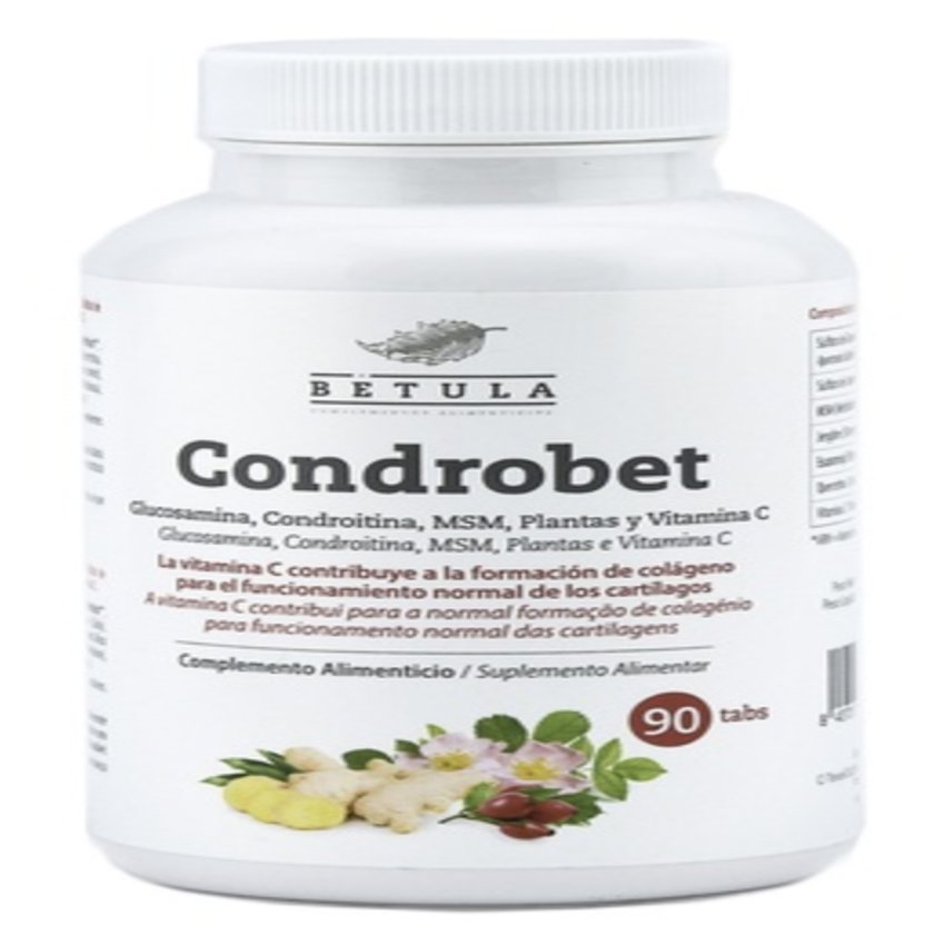 Tanto la glucosamina como la condroitina son importantes moléculas del tejido conjuntivo por su gran capacidad de captar agua y de formar estructuras muy hidratadas y geles, con gran capacidad elástica, lubricante y amortiguadora. Por ese motivo ambas son componentes básicos de moléculas del tejido conjuntivo como glicosaminoglicanos, proteoglicanos o ácido hialurónico, necesarias para la adecuada función de huesos, cartílagos, tendones y ligamentos. El mineral azufre y el colágeno son también otros componentes abundantes en estas estructuras del tejido conjuntivo. Condrobet, por su selección de nutrientes y por las cantidades aportadas, es una de las fórmulas articulares más completas. 500 mg de glucosamina y 200 mg de sulfato de condroitina, que son además fuentes de azufre. 200 mg de metilsulfonilmetano o MSM, una molécula azufrada de elevada biodisponibilidad Contiene extractos concentrados de escaramujo y de jengibre, así como 50 mg de quercetina, todos ellos de reconocida sinergia con la glucosamina y la condroitina. La vitamina C contribuye a la formación normal de colágeno para el correcto funcionamiento de los cartílagos.