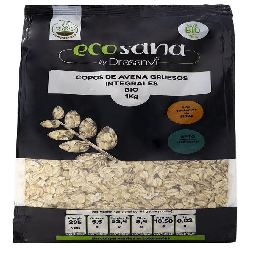 Copos de Avena Gruesos Integrales Bio de Ecosana proporcionan mucha energía, por lo que es muy recomendado para deportistas y estudiantes. Contiene hidratos de carbono complejos, que son asimilados por el cuerpo lentamente, proporcionando una sensación de saciedad y además tienen un bajo contenido de grasas saturadas.