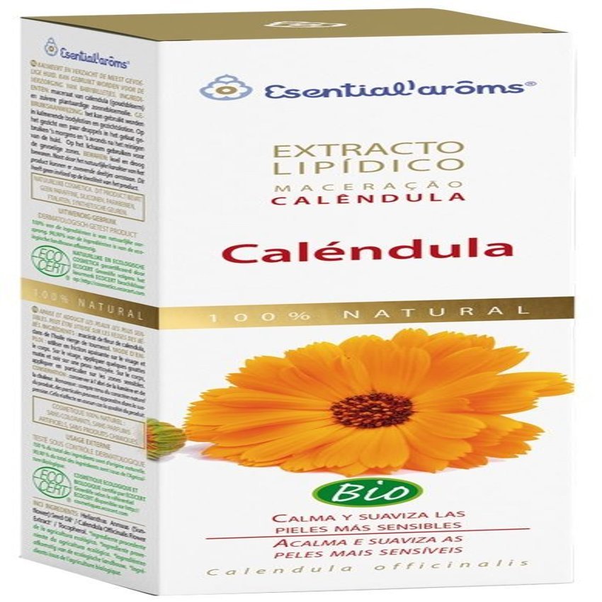 El extracto Lipídico Caléndula de Esential’Aroms es un producto obtenido a través de la maceración de las flores de caléndula. Su contenido en aceite esencial, bioflavonoides, carotenoides y pigmentos xantofílicos confieren a este macerado de flores propiedades desirritantes que ayudan a calmar y suavizar la piel. Propiedades e indicaciones: Hidratante y nutritivo. Calmante. Suavizante de la piel. Piel seca, muy seca con descamación. Calma las irritaciones cutáneas. Cuidado del culito del bebé. Ingredientes (INCI): Helianthus Annuus (Sunflower) Seed Oil* / Calendula Offcinalis FlowerExtract* /Tocopherol**. (*) Ingrediente procedente de la Agricultura Ecológica. (**) El tocopherol es vitamina E y es de procedencia natural. El 100% del total de los ingredientes es de origen natural. El 99.90% del total de los ingredientes procede de la Agricultura Ecológica.