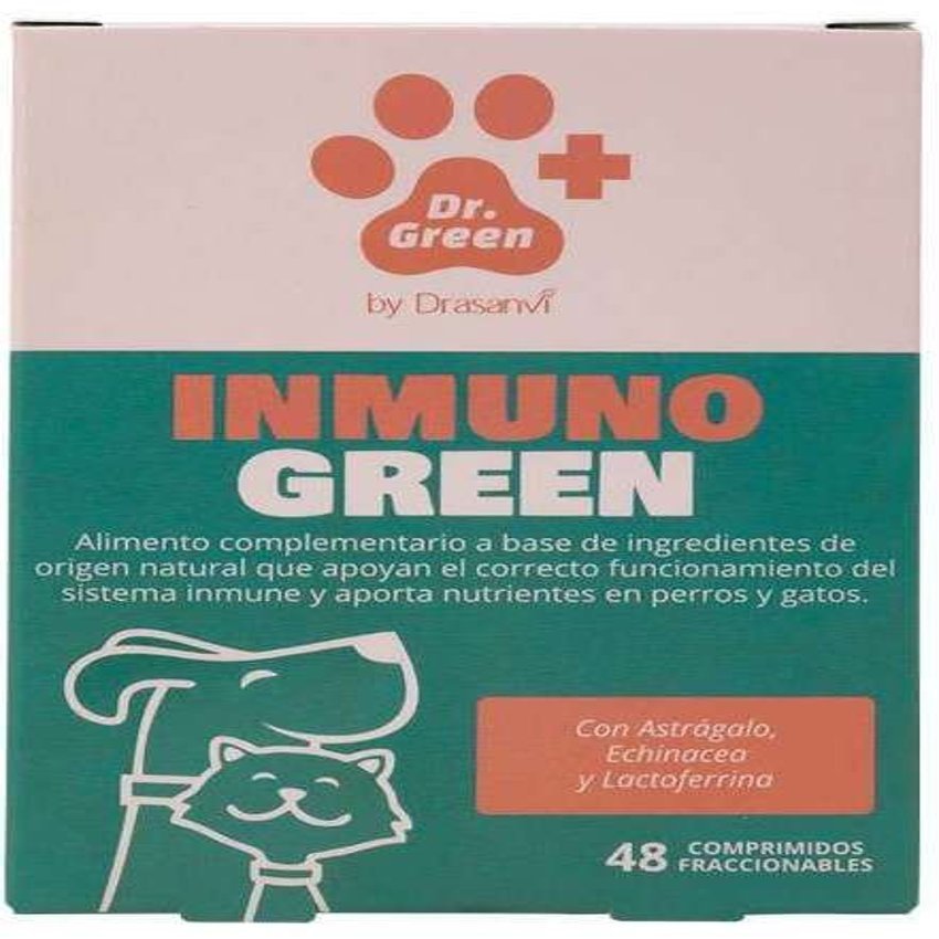 InmunoGreen es un complemento nutricional a base de ingredientes de origen natural para potenciar el sistema inmune y aumentar la protección de perros y gatos frente a diversos agentes infecciosos externos. InmunoGreen está indicado para Perros y gatos con problemas en su sistema inmune que precisen de un incremento de sus defensas para luchar contra una patología infecciosa existente o como preventivo. Principios activos: Echinácea : Contiene echinacósido, con propiedades antivirales y antibacterianas demostradas en estudios in vitro. Es rica en polifenoles y es útil en infecciones recurrentes del tracto respiratorio superior y vías urinarias inferiores. Astrágalo: Ayuda en casos de debilidad o falta de apetito. Aumenta la producción de leucocitos, TNF-α, interleucina-6 e interferón. Lactoferrina : Tiene actividad antimicrobiana frente a diversos patógenos como hongos, bacterias y virus. Actúa afectando la superficie de estos microorganismos o secuestrando el Hierro que necesitan para su metabolismo. Zinc: Incrementa el número y la actividad de los macrófagos. Es, además, un antiviral directo porque impide la acción de enzimas necesarias en la replicación viral. El zinc posee un efecto antiviral en diferentes especies de virus. Cuando está en deficiencia aumenta la probabilidad de infección respiratoria. Selenio, Vitamina E y C: Como antioxidantes, muy necesarios en caso de inflamación e infección. El Selenio, además, permite la actuación de los neutrófilos y la síntesis de anticuerpos, mejorando la respuesta inmunitaria frente a elementos extraños. Vitaminas del grupo B: Para favorecer la salud del sistema inmune y como prevención de la anemia. Composición: Astragalus membranaceus (16% polisacáridos), Echinacea purpurea raíz (4% flavonoides), Echinacea angustifolia raíz (4% echinacósidos), Vitamina E (d-alpha tocoferol) 50%, Sulfato de zinc (35,7% de zinc), Biotina pura (Vitamina H), Ácido fólico (Vitamina B9), Vitamina B5 (d-pantotenato calcio), Lactoferina, Vitamina B1 (clorhidrato tiamina), Vitamina B12 (cianocobalamina) 0,1%, Ácido ascórbico (Vitamina C), Selenito sódico (50% Selenio), Aroma natural de carne.