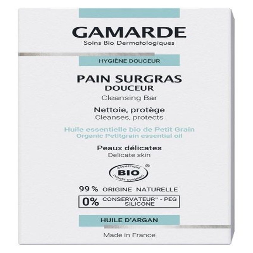 El Jabón Dermatológico de Gamarde es rico en aceite de argán orgánico, limpia la piel gracias a su espuma fina y cremosa. Sus activos supergrasantes devuelven suavidad, vitalidad y flexibilidad a las pieles secas y delicadas. Contiene manteca de karité con propiedades nutritivas. Ingredientes (INCI): Sodium palmate*, sodium cocoate*, aqua (Water), Glycerin, Argania spinosa kernel oil*, Citrus aurantium amara (Bitter Orange) leaf/twig oil*, Butyrospermum parkii (Shea) butter*, Sesamum indicum (Sesame) seed oil*, Simmondsia chinensis (Jojoba) seed oil*, Triticum vulgare (Wheat) germ oil, tocopherol, sodium chloride, tetrasodium glutamate diacetate, CI 77891, silica, geraniol**, limonene**, linalool**. *Ingredientes procedentes de agricultura ecológica. ** Ingredientes naturalmente presentes en los aceites esenciales.