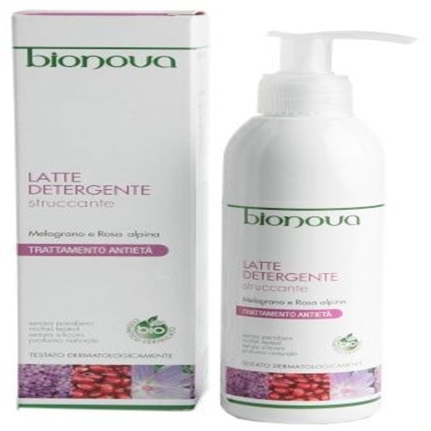 Leche desmaquillante ecológica Bionova limpia de forma delicada el maquillaje y las impurezas de la piel sin renunciar a la acción antiedad. Gracias a la suave acción limpiadora del aceite de almendras dulces en combinación con las propiedades antiedad del extracto de granada y rosa de los alpes. La piel queda inmediatamente limpia y luminosa, suave e hidratada. Ingredientes (INCI): Aqua, Ethyl hexyl palmitate,Glycerin, Macadamia ternifolia seed oil*,C14-22 Alcohol, Aloe barbadensis leaf juice*,Buddleja davidii extract*, Rhododendron ferrugineum extract*, Punica granatum fruit extract, C12-20 alkyl glucoside, Myristyl alcohol, Xanthan gum, Myristyl glucoside, Dehydroacetic acid, Tocopheryl acetate, Parfum**, Lactic acid, Benzyl alcohol, Linalool**, Benzyl salicylate**, Limonene**, Eugenol**,Citronellol**. (*) Ingredientes de agricultura ecológica. (**) De aceites esenciales naturales.