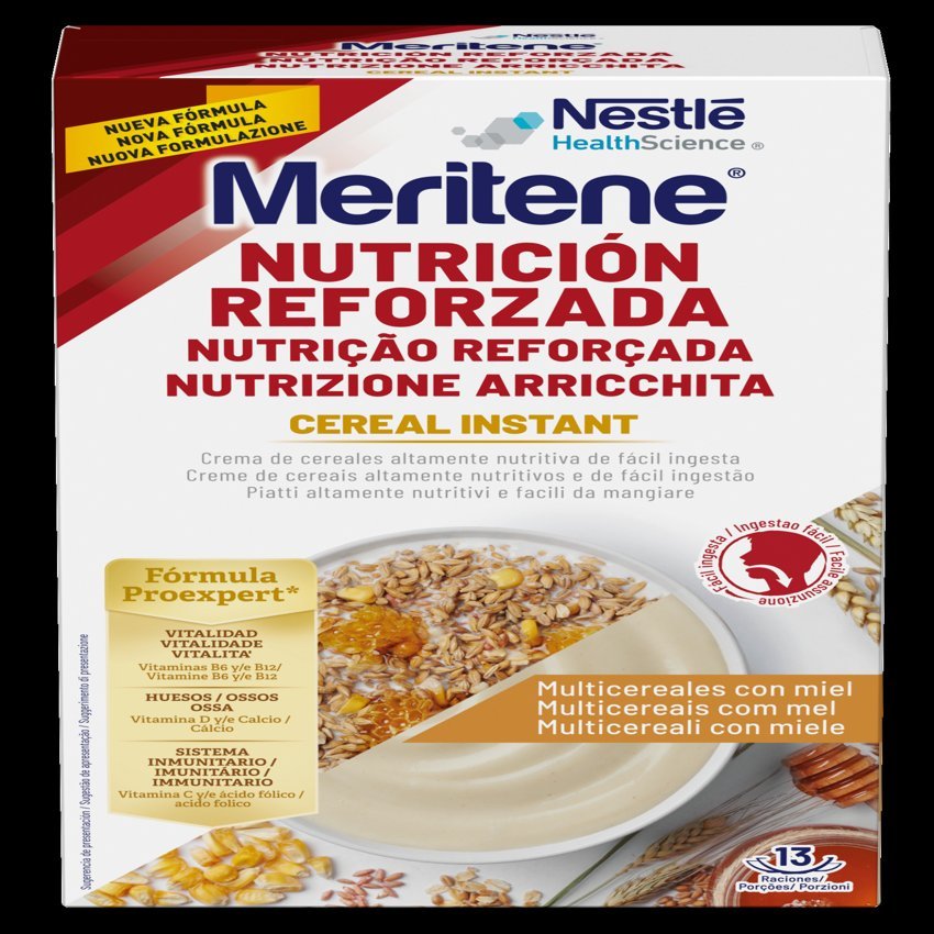 Cada cucharada de Meritene® Nutrición Reforzada Cereal Instant Multicereales con Miel aporta los nutrientes necesarios para un desayuno equilibrado y de textura adecuada para aquellas personas mayores con dificultades para tragar y/o masticar. Además, gracias a su fórmula Proexpert, se refuerza el aporte en vitaminas y minerales. Con vitaminas B6, B12 y Hierro que ayudan a disminuir el cansancio y la fatiga. Con vitamina D y Calcio que contribuyen al mantenimiento normal de los huesos. Con vitamina C y Ácido fólico que contribuyen al funcionamiento normal del sistema inmunitario. Meritene® Nutrición Reforzada Cereal Instant Cereales con Miel es ideal para los desayunos y meriendas. Indicaciones: Destinado a la nutrición de las personas mayores con dificultad para tragar y/o masticar. Falta de apetito ligado al envejecimiento. Beneficios: Meritene® Cereal Instant contribuye a aumentar el aporte energético y nutricional de la dieta, ya que es fuente de proteínas que contribuyen al mantenimiento de la masa muscular; es rico en Calcio y vitamina D, que ayudan al mantenimiento normal de los huesos; y es rico en Hierro y Zinc, que contribuyen al funcionamiento normal del sistema inmunitario. Su suave y deliciosa textura permite tragar fácilmente sin renunciar a un delicioso sabor. Meritene® Cereal Instant 8 cereales con miel es ideal para los desayunos y meriendas de las personas mayores que tienen dificultad de masticación y o deglución. Información nutricional por 100 gramos: Valor Energético KJ: 1.653 kJ. Valor Energético KCal: 390 kcal. Proteínas: 11 g. H. de carbono: 80 g de los cuales azúcares: 26 g. Grasas: 2 g (Saturadas: 0,4 g). Fibra: 4 g. Sal: 0,05 g. Vitamina A: 800 mcg. Vitamina D: 9 mcg. Vitamina E: 7 mg. Vitamina K: 50 mg. Vitamina C: 75 mg. Tiamina: 1,3 mg. Riboflavina: 1,2 mg. Niacina: 13 mg. Vitamina B6: 1,6 mg. Ácido fólico: 260 mcg. Vitamina B12: 2 mcg. Biotina: 30 mcg. Ácido pantoténico: 4,8 mg. Potasio: 170 mg. Calcio: 90 mg. Manganeso: 2 mg. Yodo: 70 mcg.