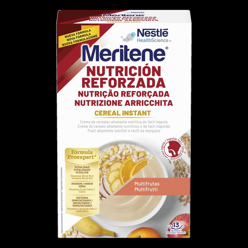 Meritene® Nutrición Reforzada Cereal Instant – Multifrutas es una crema de cereales altamente nutritiva de fácil ingesta. La crema de cereales multifrutas contribuye a aumentar el aporte calórico y nutricional de la dieta. Elaborada a base de cereales, con vitaminas y minerales. Ideal para desayunos y meriendas. La crema de cereales Meritene® Cereal Instant Multifrutas está pensada para aquellas personas mayores con dificultades para tragar y/o masticar. Gracias a su excelente sabor es ideal para el desayuno y/o merienda y ayuda a cubrir las necesidades nutricionales diarias. Con Meritene® Nutrición Reforzada recupera la tranquilidad y el interés por las comidas. Indicaciones: Destinado a la nutrición de las personas mayores con dificultad para tragar y/o masticar. Falta de apetito ligado al envejecimiento. Beneficios: Meritene® Cereal Instant contribuye a aumentar el aporte energético y nutricional de la dieta, ya que es fuente de proteínas que contribuyen al mantenimiento de la masa muscular; es rico en Calcio y vitamina D, que ayudan al mantenimiento normal de los huesos; y es rico en Hierro y Zinc, que contribuyen al funcionamiento normal del sistema inmunitario. Su suave y deliciosa textura permite tragar fácilmente sin renunciar a un delicioso sabor. Meritene® Cereal Instant multifrutas es ideal para los desayunos y meriendas de las personas mayores que tienen dificultad de masticación y o deglución.