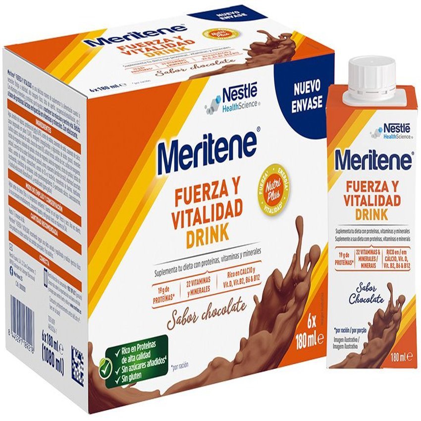 Meritene® Fuerza y Vitalidad es una solución nutricional en formato bebible listo para tomar. El batido de chocolate se elabora con la fórmula NutriPlus que contiene proteínas, de alta calidad, vitaminas y minerales. Los ingredientes de Meritene® Fuerza y Vitalidad Chocolate permiten suplementar la dieta, contribuyen a disminuir el cansancio y la fatiga y al funcionamiento normal del sistema inmune. Indicaciones: 1. Personas que buscan un refuerzo en su alimentación porque tienen una menor ingesta o requerimientos nutricionales aumentados. 2. Personas que necesitan recuperarse en fases de convalecencia (proceso viral, intervención quirúrgica…) o reforzar su estado de salud. 3. Personas con cansancio y falta de fuerzas. 4. Personas que buscan un refuerzo nutricional integrable en una dieta para intolerantes a la lactosa. 5. Prefieren un formato de poco volumen y listo para tomar. Beneficios: Fuerza: Con proteínas, de alta calidad, que contribuyen a aumentar y conservar la masa muscular. Con calcio y vitamina D, que contribuyen al mantenimiento de los huesos en condiciones normales. Vitalidad: Con vitaminas B2 y B6, que ayudan a disminuir el cansancio y la fatiga. Sistema Inmunitario: Con vitamina C, D, Zinc y Selenio que contribuyen al funcionamiento normal del sistema inmunitario.