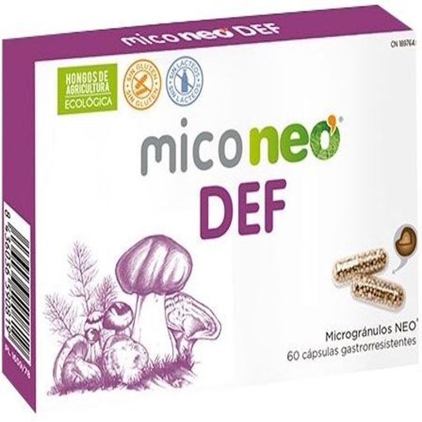 MicoNeo DEF · Neo · 60 cápsulas: Mico Neo DEF se obtiene a partir de extractos puros de hongos de producción ecológica, de producción ecológica, libre de maltodextrinas y alérgenos. Se presenta en cápsulas gastroresistentes, que permiten proteger los activos del hongo del medio ácido, además de mejorar su biodisponibilidad gracias a la galénica en microgránulo, una avanzada tecnología que optimiza, protege y modula la liberación de los principios activos. En su fabricación, se incorpora vitamina C natural, obtenida de la especie Camu Camu (Myrciaria dubia), en la cubierta exterior del microgránulo.