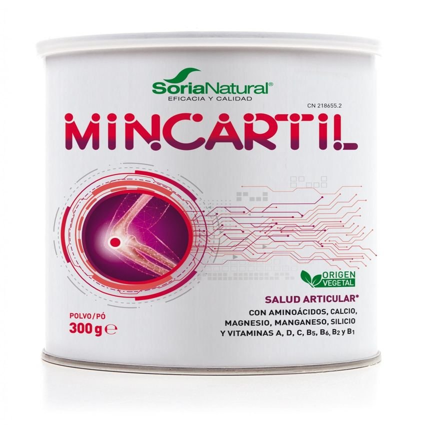 Mincartil es una importante fuente de aminoácidos de origen vegetal, con minerales (calcio, magnesio, manganeso y silicio) y vitaminas (C, A, D y grupo B). Los aminoácidos constituyen la base estructural del colágeno, componente fundamental del cartílago de las articulaciones. Sin gelatina animal. Origen Vegetal Asimilación rápida y completa de todos sus componentes. Gran biodisponibilidad. Apto diabéticos. Mincartil contiene vitamina D, calcio y magnesio que contribuyen al mantenimiento de los huesos en condiciones normales. Tiene vitamina C que contribuye a la formación normal del colágeno para el funcionamiento normal de huesos y cartílagos. También contiene manganeso que contribuye a la formación normal del tejido conectivo. Útil en los siguientes casos: Niños en época de crecimiento. Deportistas. En personas de cualquier edad que presenten una mala conservación o alteración del cartílago. Afecciones reumáticas: artrosis, artritis, hernia de disco, etc. Prevención de la osteoporosis (menopausia, dietas pobres en calcio, vida sedentaria, toma de corticoides, antiepilépticos o heparina). Cualquier persona a partir de los 40 años. Embarazo y lactancia. Fragilidad de uñas y pelo, caída de pelo. Favorecer la cicatrización de heridas. Composición: Aislado de proteína de soja (Glycine max (L.) Merr., semilla), lactato cálcico, corrector de acidez: ácido cítrico, cloruro de magnesio, aroma a piña, edulcorante: acesulfamo K, ácido L-ascórbico (Vit. C), sal, fructosa, gluconato de manganeso, dióxido de silicio, pantotenato cálcico, acetato de retinilo (Vit. A), ácido silícico, edulcorante: neohesperidina DC, clorhidrato de piridoxina (Vit. B6), colecalciferol (Vit. D), riboflavina (Vit. B2), tiamina (Vit. B1).
