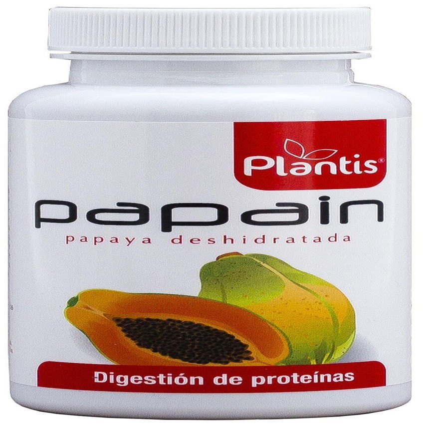 La papaya (Carica papaya L.) es un árbol de 4-8 m con un ramillete terminal de hojas lo que hace que se asemeje a una palmera, sus frutos son bayas de gran tamaño muy apreciados por su sabor. De los frutos antes de su madurez se obtiene por incisión el látex que es la parte usada popularmente gracias a sus beneficiosas propiedades digestivas. El látex es rico en enzimas proteolíticas como la papaína, y la quimopapaína que favorecen la digestión de las proteínas, así como en vitaminas y carotenos. Tradicionalmente la papaya se ha utilizado para el tratamiento de dispepsias, úlcera péptica, gastritis, insuficiencia pancreática exocrina, infecciones parasitarias intestinales (ascaridiasis, enterobiasis, teniasis, toxocariasis o tricuriasis). Papain de Plantis son cápsulas vegetales con un 94% de papaya deshidrata enriquecida con papaína para así potenciar los efectos de los enzimas naturales de la papaya. Actualmente nuestra alimentación no siempre es equilibrada y nuestra dieta comporta un consumo excesivo de proteínas que dificultan el proceso digestivo desencadenando en digestiones pesadas acompañadas de ardor de estómago, sensación de pesadez, etc. Con la ingesta antes de las comidas de cápsulas de Papain, favorecemos la digestión de las proteínas y por tanto el proceso digestivo.