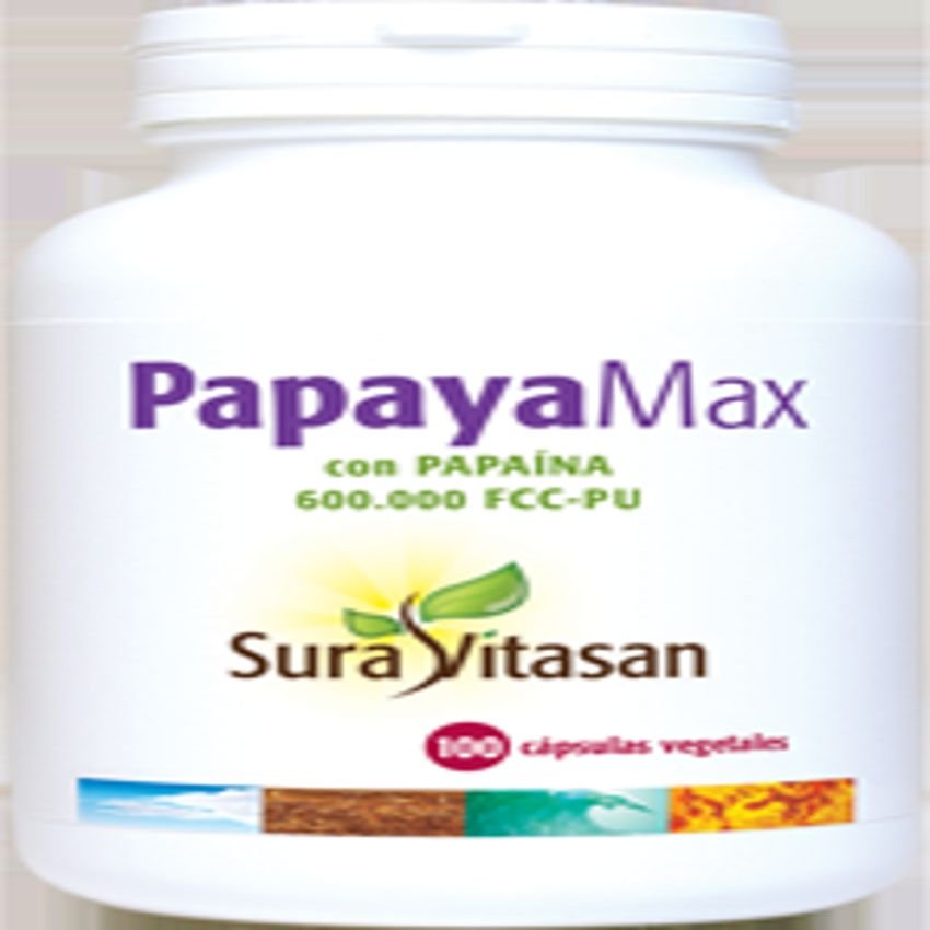 Papaya Max de Sura Vitasan. Cada cápsula de PapayaMax contiene 250 mg de papaya formulada con 6 mg de papaína (600.000.