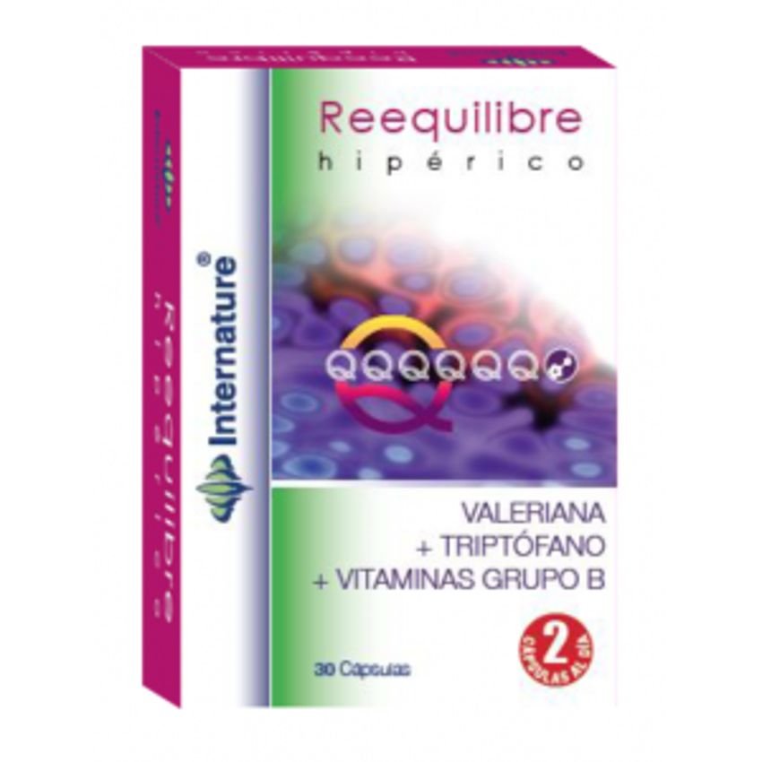 Reequilibre es un producto formulado para calmar los estados de ansiedad que posee efectos sedantes para ayudar a conciliar el sueño. Ideado para mejorar estados de nervosismo, insomnio, ansiedad, depresión…Por su composición es un excelente relajante para ayudar a conciliar el sueño. Ingredientes activos por cápsula: 125 mg de extracto seco 7:1 de hipérico. 80 mg de extracto seco de valeriana. 50 mg de L-Glutamina. 50 mg de L–Triptófano. 50 mg de clorhidrato de piridoxina (vitamina B6). 50 mg de clorhidrato de tiamina (vitamina B1). 40 mg de extracto seco de espliego 30 mg de extracto seco de melisa. 20 mg de extracto seco de albahaca. 100 mcg de ácido fólico. 2,5 mcg de hidroxicobalamina (vitamina B12).