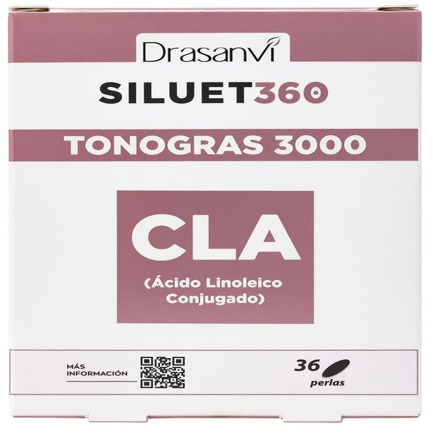 Siluet 360 – Tonogras CLA · Drasanvi · 36 perlas: El CLA, ácido linoleico conjugado, es un ácido graso esencial producido por la flora intestinal de los animales rumiantes, a partir del ácido linoleico. La producción es más alta cuando el animal se alimenta pastando y no ingiere piensos. Algunos estudios realizados sugieren que el CLA ayuda a reducir el peso corporal.