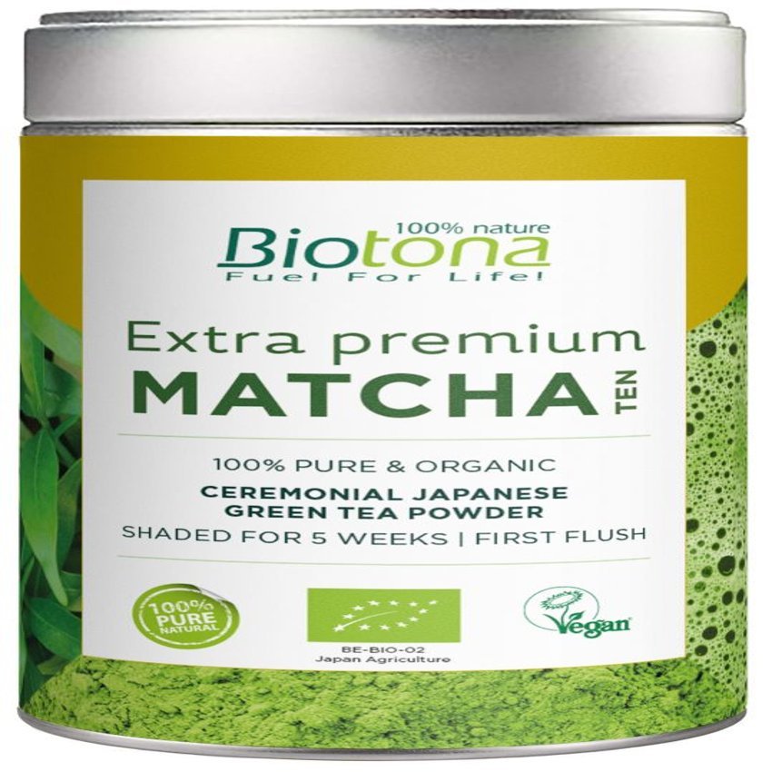 Té Extra Premium Matcha de Biotona es un té verde primaveral de Japón con ricos sabores de frutas y un intenso sabor “umami” (gracias a su teanina). Se produce exclusivamente a partir de hojas jóvenes de té que, según la tradición, se cosechan a mano a principios de mayo (en la primera cosecha) después de sombrear los arbustos durante 5 semanas.