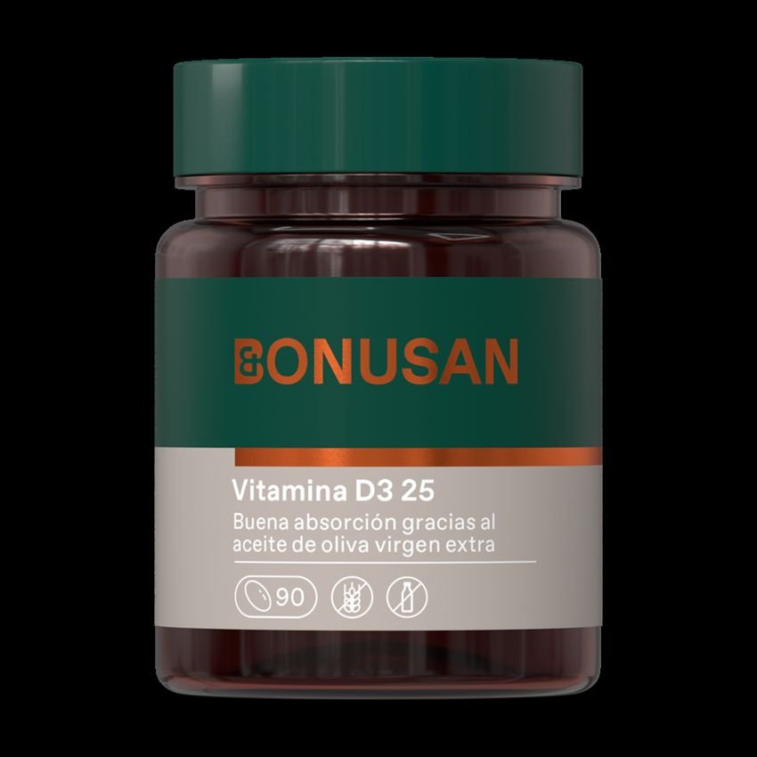 Vitamina D3 25 mcg · Bonusan · 90 perlas: La vitamina D3 juega un papel importante en el mantenimiento de huesos y dientes fuertes. Promueve la absorción de calcio en los huesos y ayuda a mantener los niveles normales de calcio en sangre. También tiene un impacto positivo sobre el sistema inmunológico, el proceso de renovación celular y apoya unos músculos más fuertes y una fuerza muscular extra.