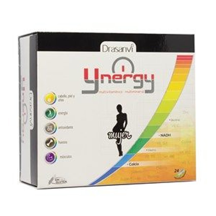 Ynergy mujer es un multivitamínico de nueva generación, gracias a su estudiada composición. Ynergymujer combina la acción de Vitaminas y Minerales reforzándolo con NADH. Está pensado para todas las mujeres que precisen de un aporte vitamínico y mineral. Ynergy mujer viene en un envase de 24 cápsulas, y sólo es necesario consumir una al día. Las cápsulas son de origen vegetal, convirtiendo al producto en ideal para personas vegetarianas y veganas. Ingredientes activos por dosis diaria: 300 mg de cálcio. 70 mg de zinc. 60 mg de vitamina C. 36 mg de vitamina E. 35 mg de hierro. 16 mg de vitamina B3. 7 mg de vitamina D. 6 mg de vitamina B5. 5 mg de NADH. 5 mg de cobre. 2,8 mg de vitamina B6. 2,5 mg de vitamina B12. 2,1 mg de vitamina B2. 2 mg de de manganeso. 1,43 mg de vitamina B1. 1,2 mg de selenio. 0,8 mg de vitamina A. 0,34 mg de cromo. 0,3 mg de vitamina K 0,3 mg de ácido fólico. 0,1 mg de biotina. 0,095 mg de molibdeno.